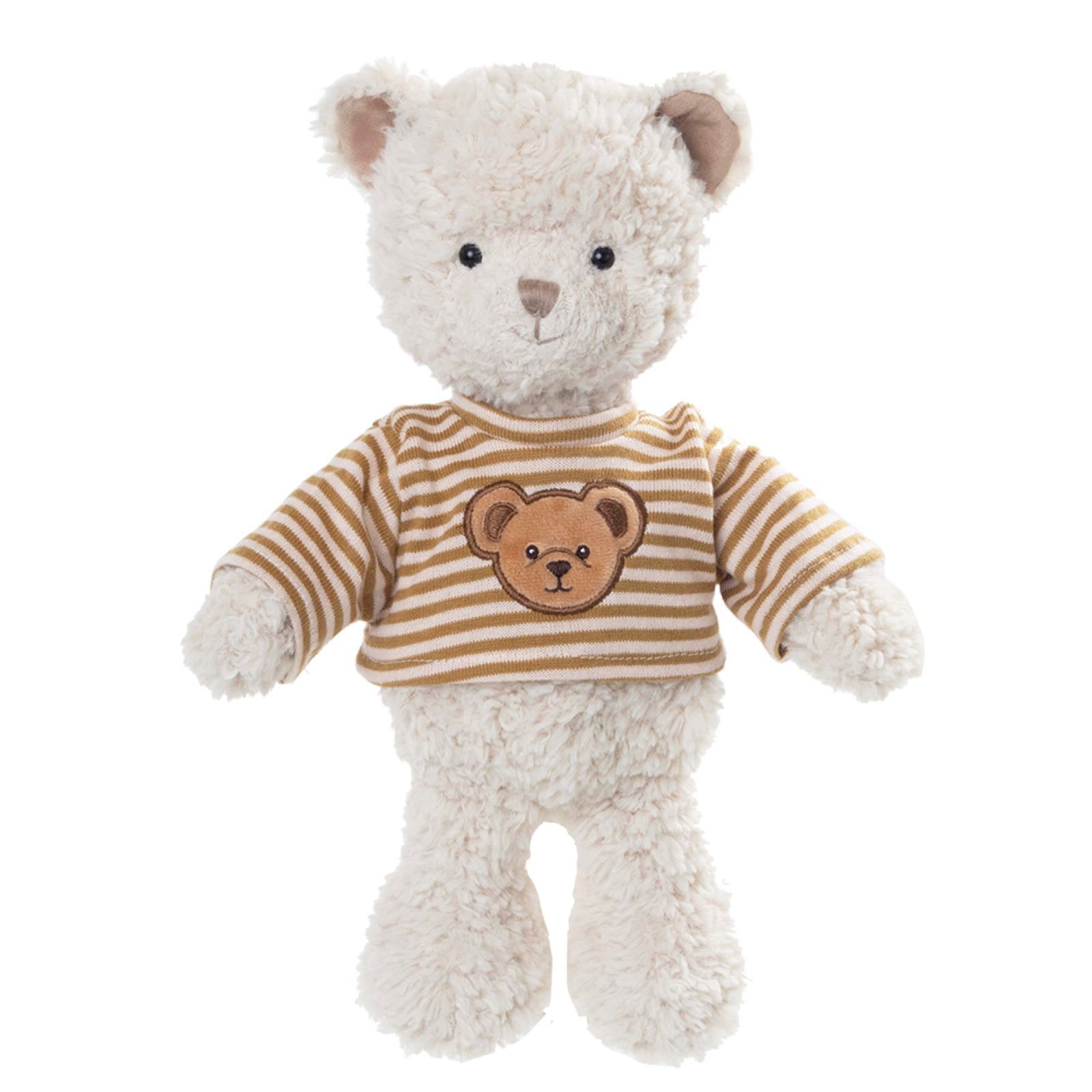 Jonas is a soft, cuddly teddy bear with textured cream fur and a friendly stitched face. He wears a mustard-and-cream striped shirt featuring an embroidered bear face for an extra touch of charm. With his classic design and huggable feel, Jonas is a delightful companion for playtime or snuggles.