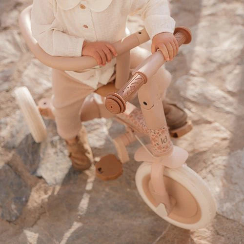 Hop, time to go out! With this beautiful soft pink and brown detailed 4-in-1 balance bike, the first (bicycle) adventures are made like this. Ideal to get to know cycling in a playful way. Can't your little one walk or cycle yourself? No problem, the push bar helps you a hand. Safety for everything, thanks to the belt and the safety ring, which can easily be removed if they are no longer needed. From tricycle to balance bike in an instant - and the pedals? You can easily store it under the saddle!