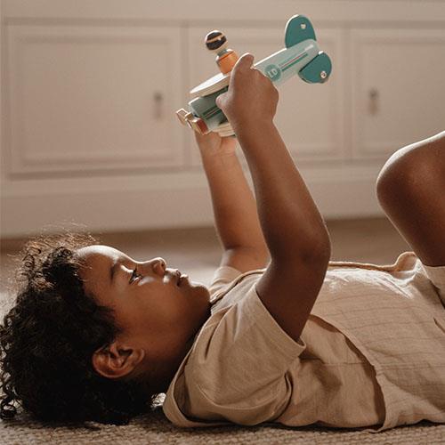 Ready for takeoff! You are the pilot in command, so start your engine, give the propeller a spin, and let's go on an adventure. This play airplane is designed for interactive and imaginative play. The smooth-rolling wheels allow your little one to glide effortlessly across the floor to explore new areas. The pilot figure fits with other playsets from the dollhouse, such as the caravan and the school bus. Let your child's imagination soar to new heights with this fun wooden play airplane.