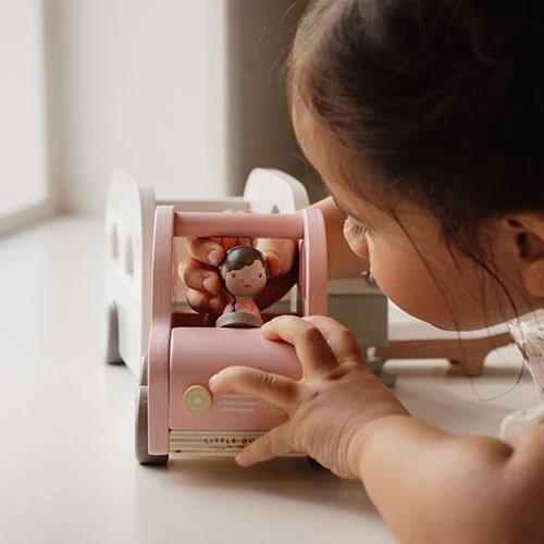 Let's go on a dream trip and hit the road! Discover the adventurous world with the cute pink car with caravan and enjoy the freedom. With the caravan, you can turn any place into a camping spot, wherever you want. Whether it's the living room, the playroom, or the kitchen, bring out the beach chair, unpack the suitcases, and let the 3 wooden figures enjoy the surroundings. The smoothly rolling wheels allow your little one to effortlessly drive across the floor in search of a new place to camp for the night. The door and roof of the caravan can open, and the figures also fit with the dollhouse and other playsets, such as the airplane and the school bus. Let your child enjoy the magic of traveling with this versatile wooden playset.