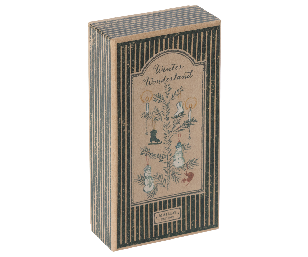 A perfect gift box containing 4 beautiful Maileg ornaments. Each ornament is wrapped in tissue paper and packed in a gift box decorated with Dorte Mailil's drawings. This set contains a snowman, his wife and 2 skates.