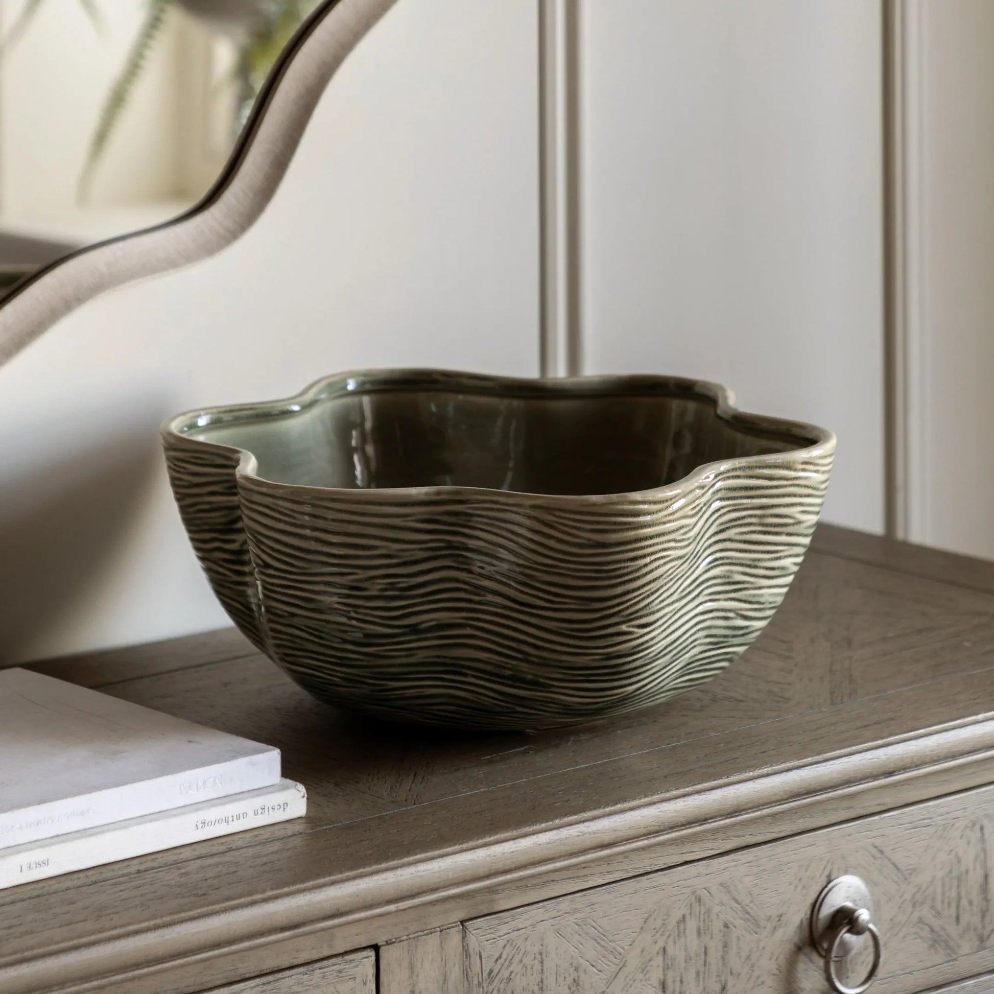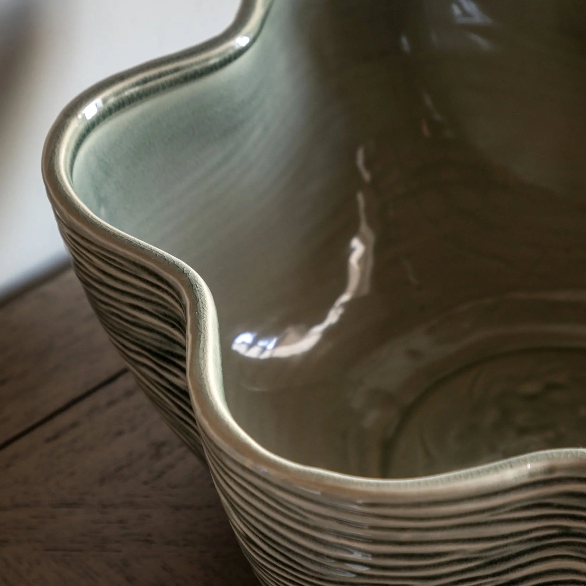 The flowing, organic shape of our Murla bowl is highlighted by ridge detailing and soft green glaze, fitting perfectly in modern and traditional interiors alike.