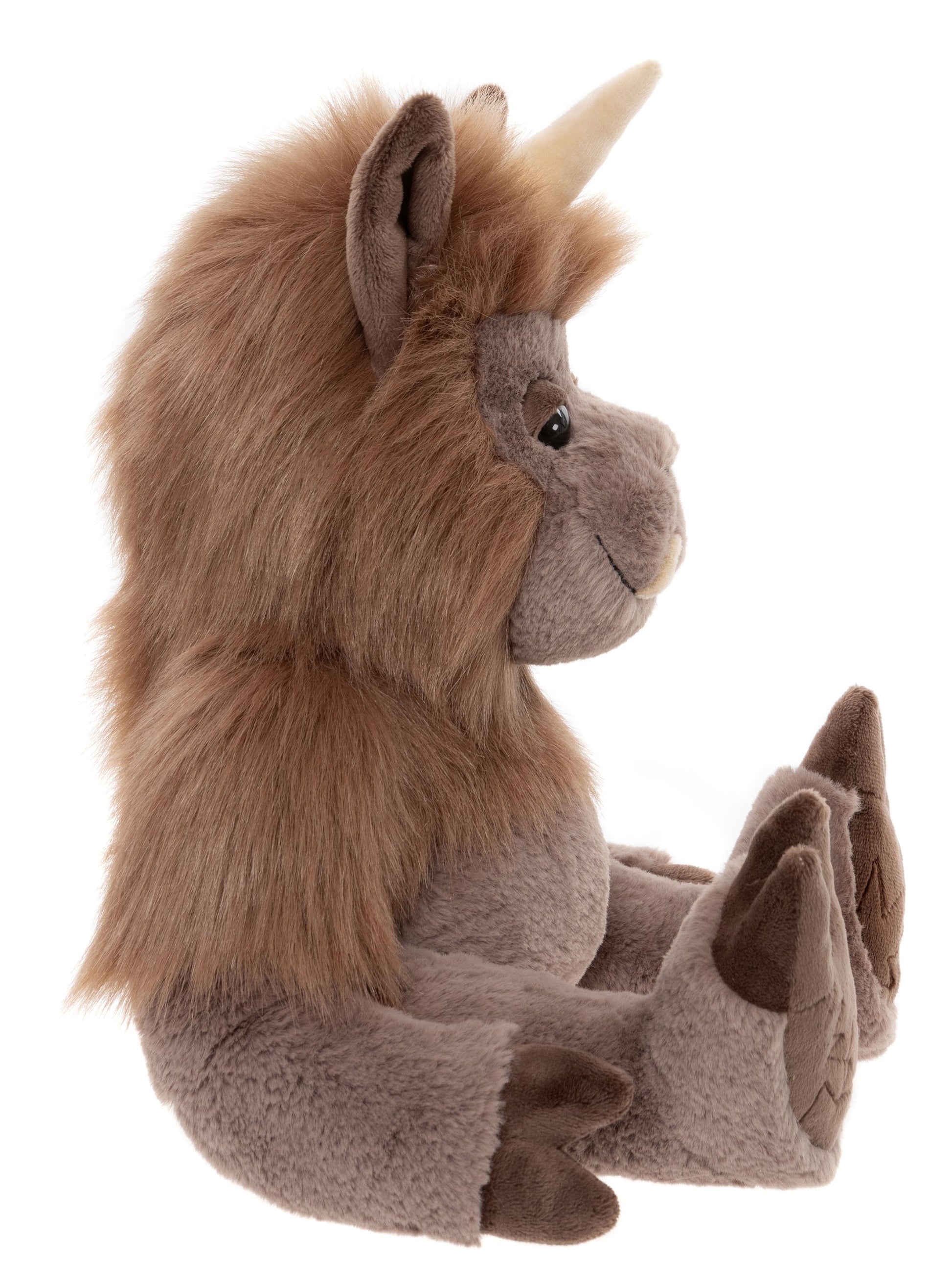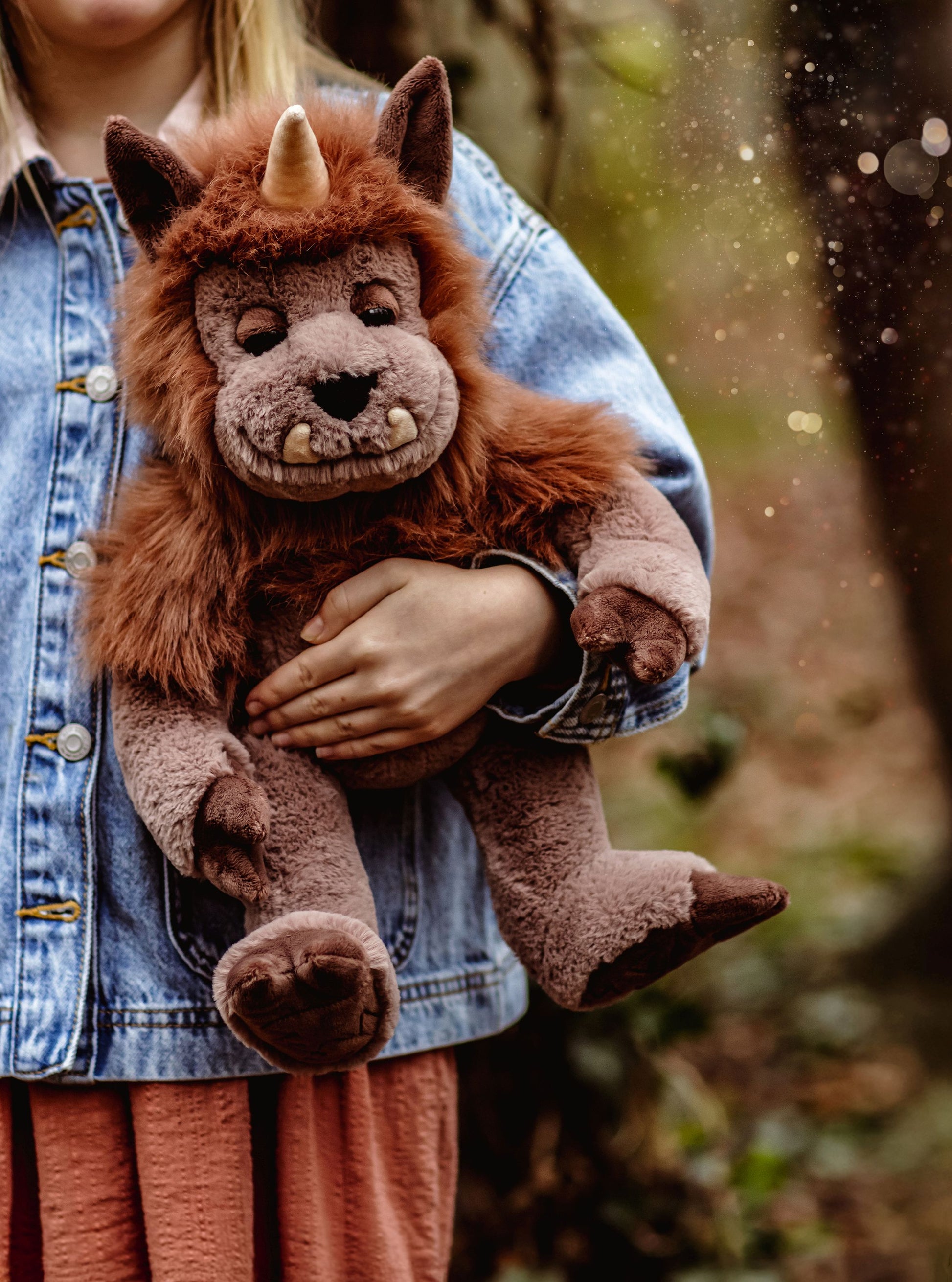 With his plush brown fur, wide, friendly smile and single proud horn atop his head, Quarry brings a touch of rugged charm to every cuddle. His cosy, non-jointed body and oversized paws make him perfect for bedtime hugs, playful adventures, or simply sitting guard on your pillow when night falls.