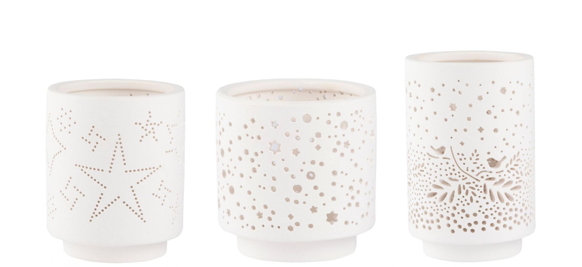Rader Porcelain Tealight Holders - Set of 3 - Winter Motif makes the perfect gift for anyone on your gift list. The beautiful porcelain candle holders with intricate decorative cutouts feature stars and birds to heighten your spirit and bring joy to your soul.