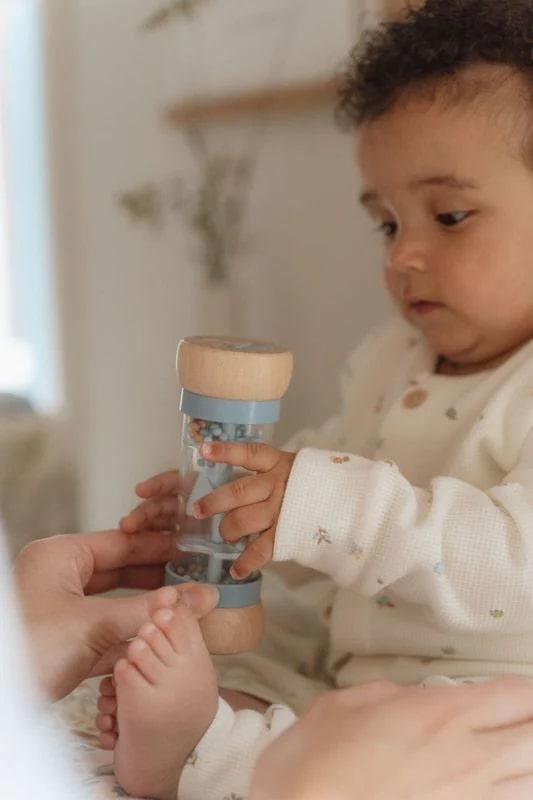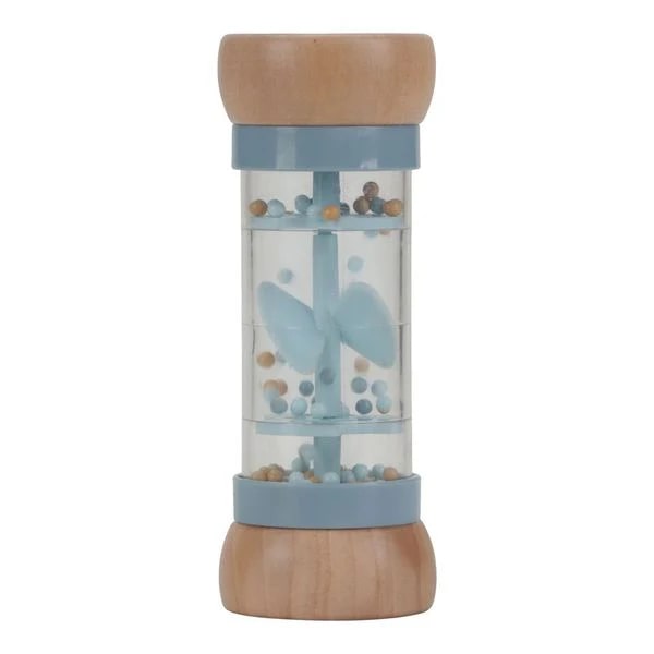 Shake and rattle! Turn the rain rattle and listen to the soothing sound of the balls moving from one side of the rainmaker to the other. It stimulates the sensory development and musical talent of your baby. The balls fall through small openings in the tube and rotate the propeller, resulting in a pleasant sound. The rain rattle is designed for little hands and is comfortable to hold. The wooden top and bottom are decorated with an illustration of a little fox and a pair of mushrooms from the Forest Friends collection.