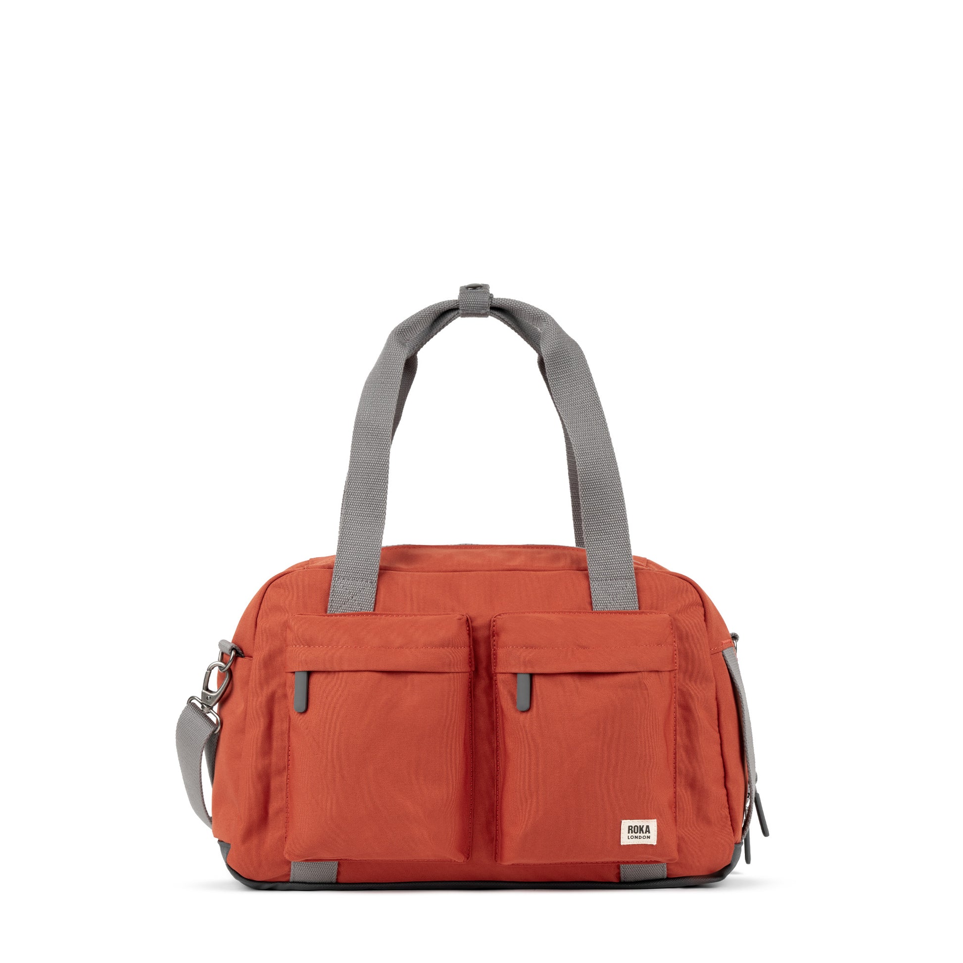 Equipped with multi-functional handles and straps, an array of pockets, and a waterproof base. Features include top handles, a detachable shoulder strap, a side grab handle, a trolley sleeve for sliding onto the handle of a suitcase, a waterproof pocket, a padded laptop sleeve accessible from outside, and one large zipped pocket on the inside.