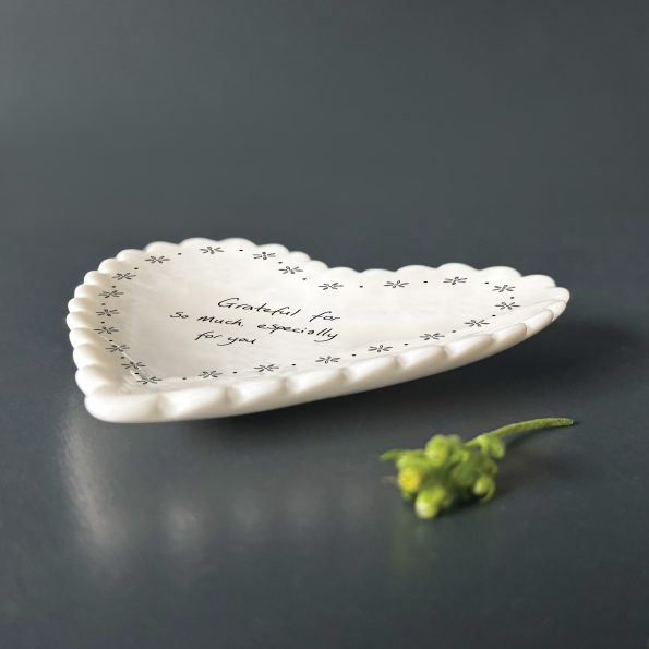 This charming porcelain Heart Dish features a delightfully scalloped edge with the message "Grateful for so much, especially for you". Perfect for holding treasured trinkets, jewellery, or everyday essentials. Comes gift boxed.