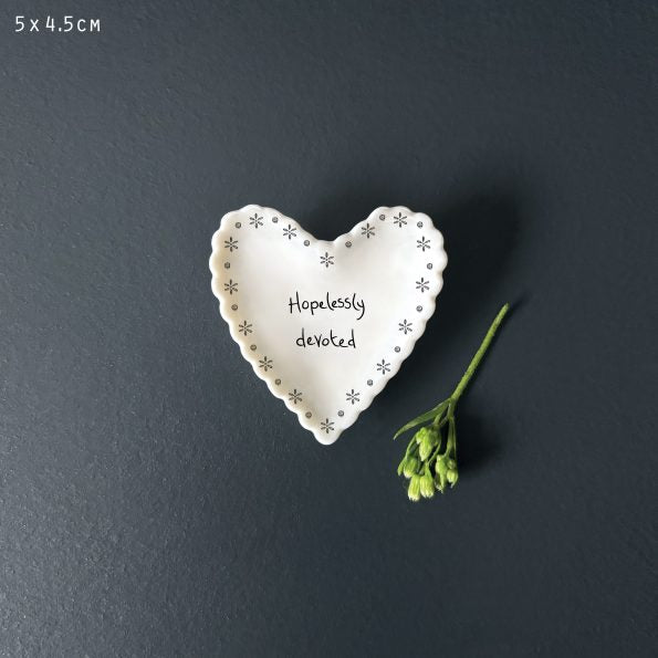 This charming porcelain Heart Dish features a delightfully scalloped edge with the message "Hopelessly devoted". Perfect for holding treasured trinkets, jewellery, or everyday essentials. A thoughtful gift for anyone who appreciates the little things that bring joy.