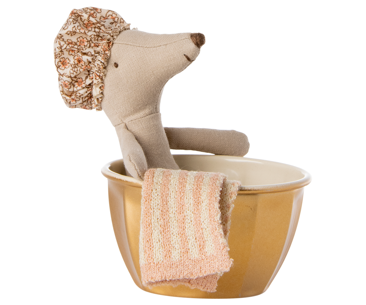 Like everyone else, this mouse loves to spend hours in the warm water in her lovely bathtub. This playset contains a golden metal bathtub, a big sister mouse, a showercap and a towel.
