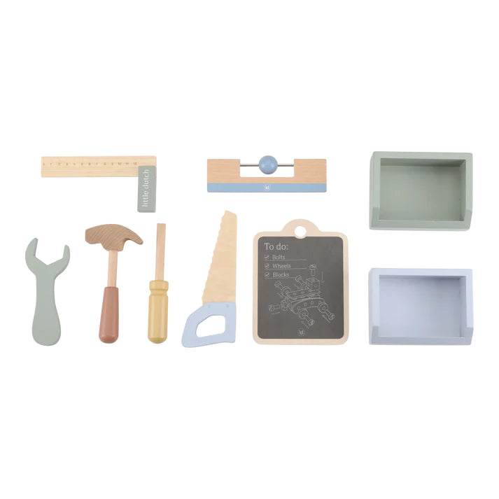 Attention little handymen and handywomen! With this sturdy wooden workbench, little ones can hammer, screw, and build whatever they want. Whether it's a cool car or their own creative construction – anything is possible! The set includes various tools, such as a circular saw, and encourages role play, motor skills, and imagination. Ready to get started?
