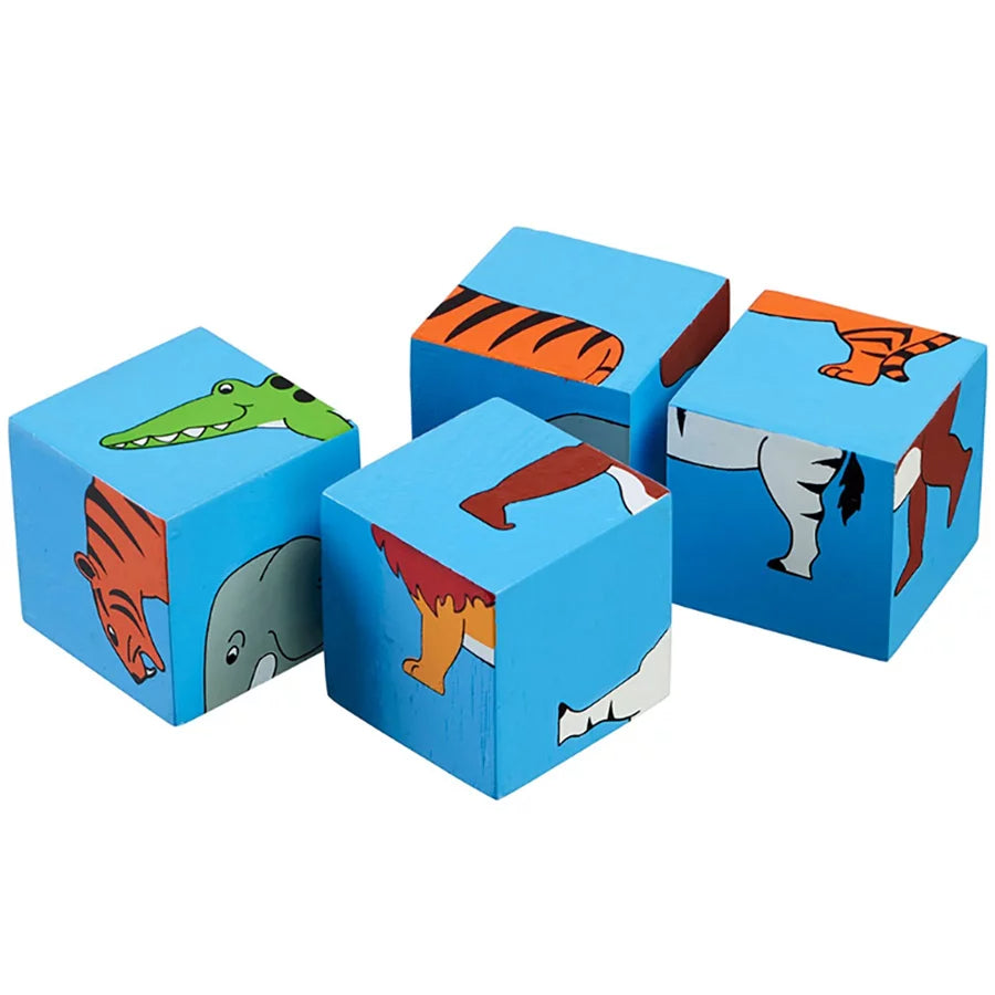 This traditional block puzzle toy has fun world animal designs. All 4 blocks have been decorated with 1 part of a colourful world animal on all 6 sides. Children will love rotating the cubes to complete the animals from around the world.